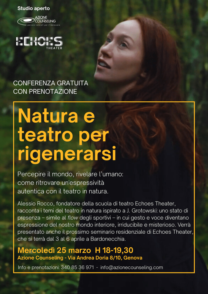 Fondata da Alessio Rocco, Echoes Theater propone corsi di teatro a Genova e seminari residenziali al mare e in montagna, con focus sulla naturalità in scena e sulla VOCE come espressione organica del CORPO.
